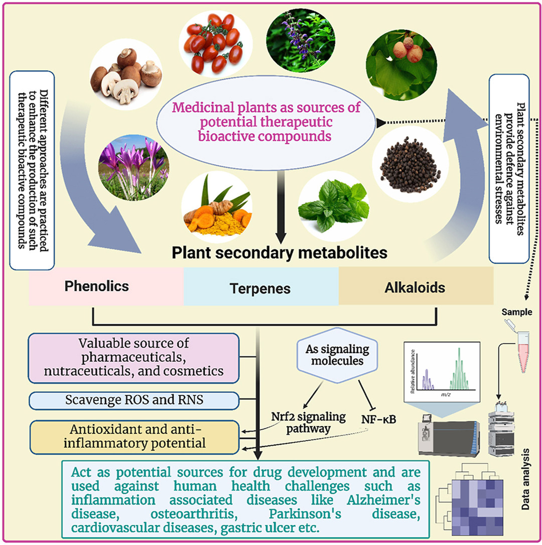 Plants produce a diverse range of secondary metabolites that serve as defense compounds against a wide range of biotic and abiotic stresses. In addition, their potential curative attributes in addressing various human diseases render them valuable in the development of pharmaceutical drugs. Different secondary metabolites including phenolics, terpenes, and alkaloids have been investigated for their antioxidant and therapeutic potential. A vast number of studies evaluated the specific compounds that possess crucial medicinal properties (such as antioxidative, anti-inflammatory, anticancerous, and antibacterial), their mechanisms of action, and potential applications in pharmacology and medicine. Therefore, an attempt has been made to characterize the secondary metabolites studied in medicinal plants, a brief overview of their biosynthetic pathways and mechanisms of action along with their signaling pathways by which they regulate various oxidative stress-related diseases in humans. Additionally, the biotechnological approaches employed to enhance their production have also been discussed. The outcome of the present review will lead to the development of novel and effective phytomedicines in the treatment of various ailments.