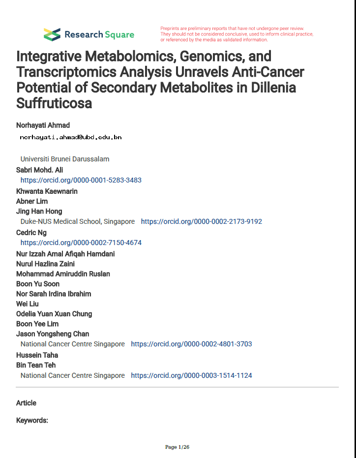 Norhayati Ahmad1, Sabri Mohd. Ali, Khwanta Kaewnarin, Abner Lim, Jing Han Hong2, Cedric Ng, Nur Izzah Amal Afiqah Hamdani, Nurul Hazlina Zaini, Mohammad Amiruddin Ruslan, Boon Yu Soon, Nor Sarah Irdina Ibrahim, Wei Liu, Odelia Yuan Xuan Chung, Boon Yee Lim, Jason Yongsheng Chan3, Hussein Taha, Bin Tean Teh3