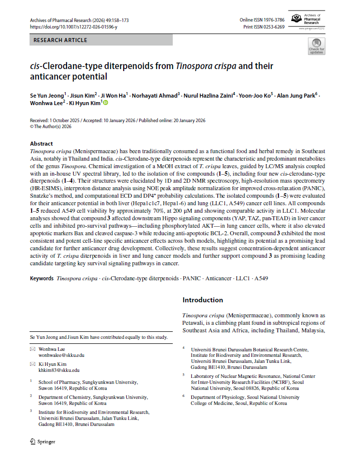 Tinospora crispa (Menispermaceae) has been traditionally consumed as a functional food and herbal remedy in Southeast Asia, notably in Thailand and India. cis-Clerodane-type diterpenoids represent the characteristic and predominant metabolites of the genus Tinospora. Chemical investigation of a MeOH extract of T. crispa leaves, guided by LC/MS analysis coupled with an in-house UV spectral library, led to the isolation of five compounds (1–5), including four new cis-clerodane-type diterpenoids (1–4). Their structures were elucidated by 1D and 2D NMR spectroscopy, high-resolution mass spectrometry (HR-ESIMS), interproton distance analysis using NOE peak amplitude normalization for improved cross-relaxation (PANIC), Snatzke’s method, and computational ECD and DP4⁺ probability calculations. The isolated compounds (1–5) were evaluated for their anticancer potential in both liver (Hepa1c1c7, Hepa1-6) and lung (LLC1, A549) cancer cell lines. All compounds 1–5 reduced A549 cell viability by approximately 70%, at 200 μM and showing comparable activity in LLC1. Molecular analyses showed that compound 3 affected downstream Hippo signaling components (YAP, TAZ, pan-TEAD) in liver cancer cells and inhibited pro-survival pathways—including phosphorylated AKT—in lung cancer cells, where it also elevated apoptotic markers Bax and cleaved caspase-3 while reducing anti-apoptotic BCL-2. Overall, compound 3 exhibited the most consistent and potent cell-line specific anticancer effects across both models, highlighting its potential as a promising lead candidate for further anticancer drug development. Collectively, these results suggest concentration-dependent anticancer activity of T. crispa diterpenoids in liver and lung cancer models and further support compound 3 as promising leading candidate targeting key survival signaling pathways in cancer.